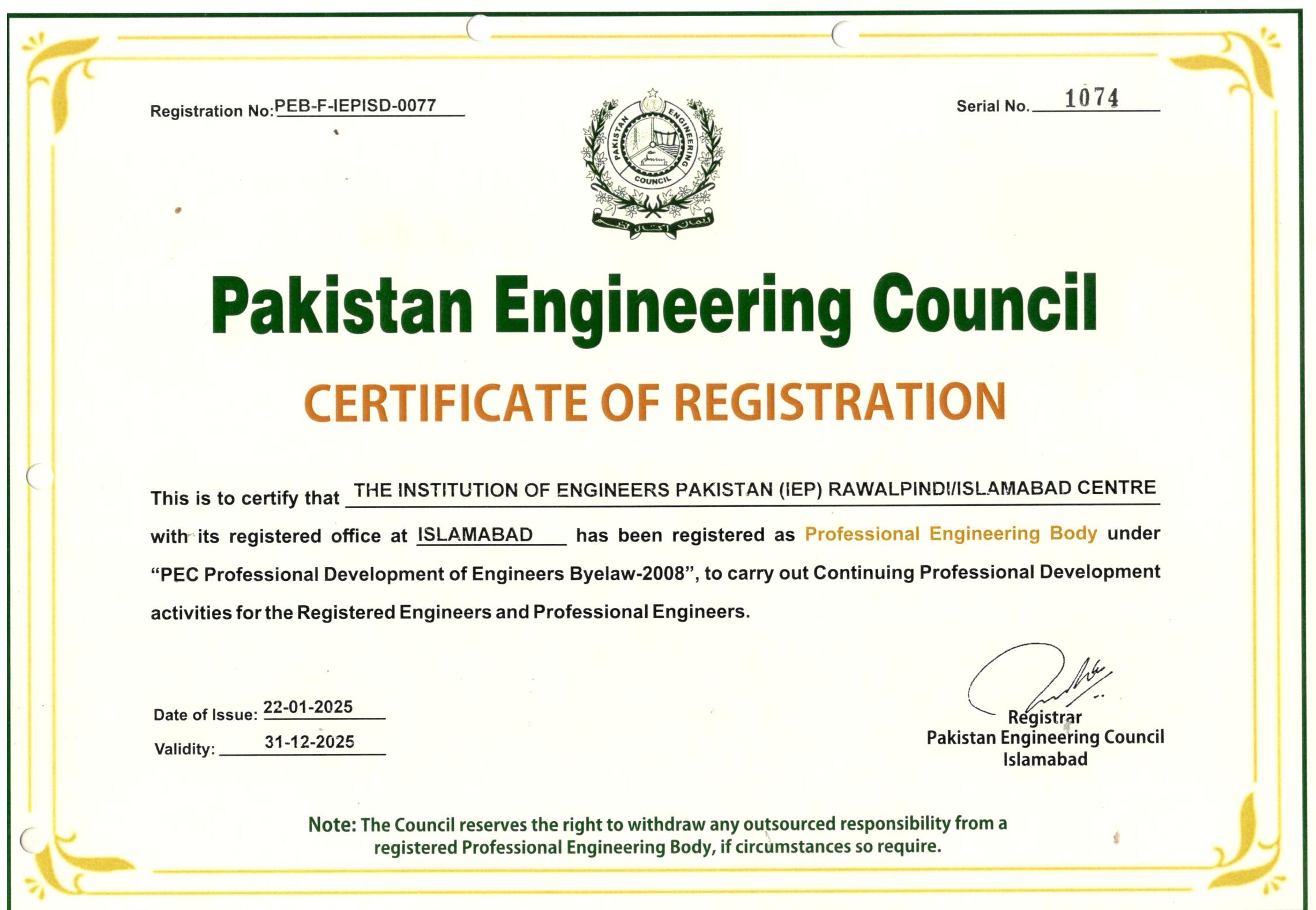 On behalf of The Institution of Engineers, Pakistan, Local Council Rawalpindi – Islamabad (IEP-RIC) Chapter, we welcome you to the IEP-RIC. The current council has been elected for term 2023-2025. Our major focus during the period will be revitalizing the role of IEP to develop, integrates and mobilize the Engineers of the region for socio-economic development of the country. Besides capacity building of the members, we will endeavor to further enhance the image of the Institution, work collaborating with other Chapters and Central Council, academic and industry for the development and welfare of Engineering Community.