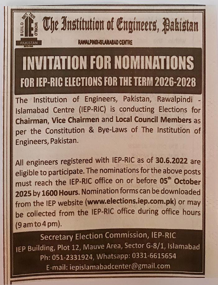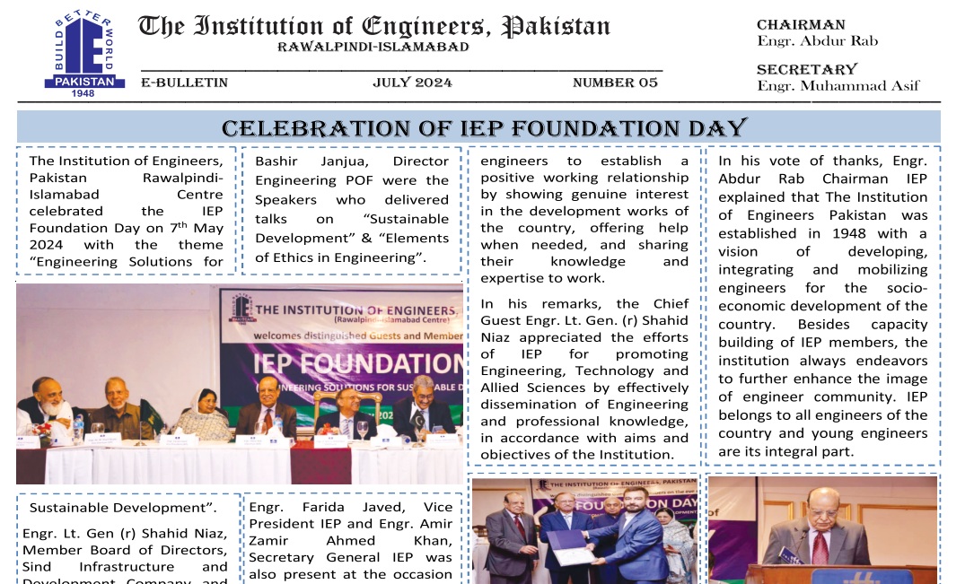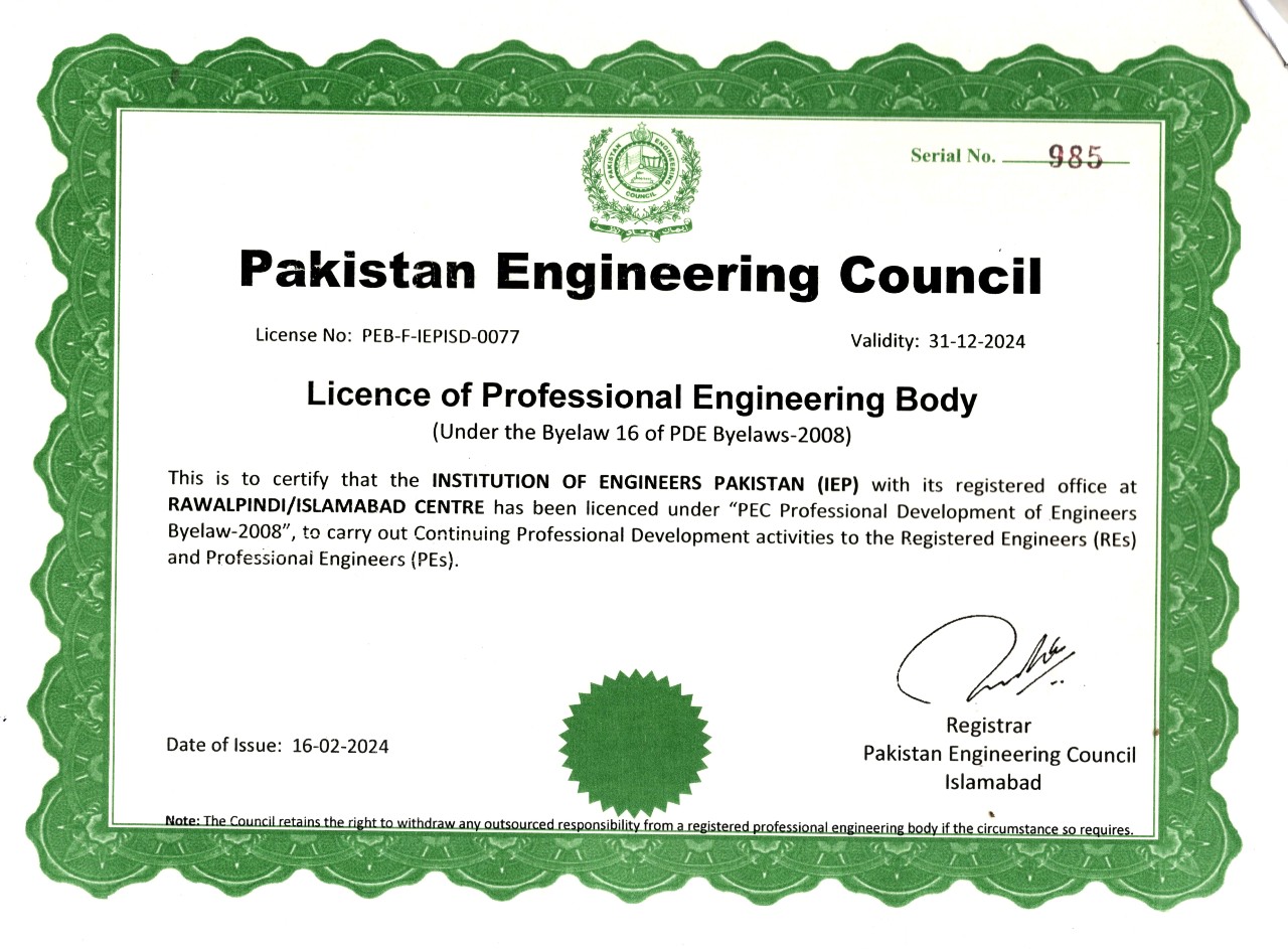 On behalf of The Institution of Engineers, Pakistan, Local Council Rawalpindi – Islamabad (IEP-RIC) Chapter, we welcome you to the IEP-RIC. The current council has been elected for term 2023-2025. Our major focus during the period will be revitalizing the role of IEP to develop, integrates and mobilize the Engineers of the region for socio-economic development of the country. Besides capacity building of the members, we will endeavor to further enhance the image of the Institution, work collaborating with other Chapters and Central Council, academic and industry for the development and welfare of Engineering Community.